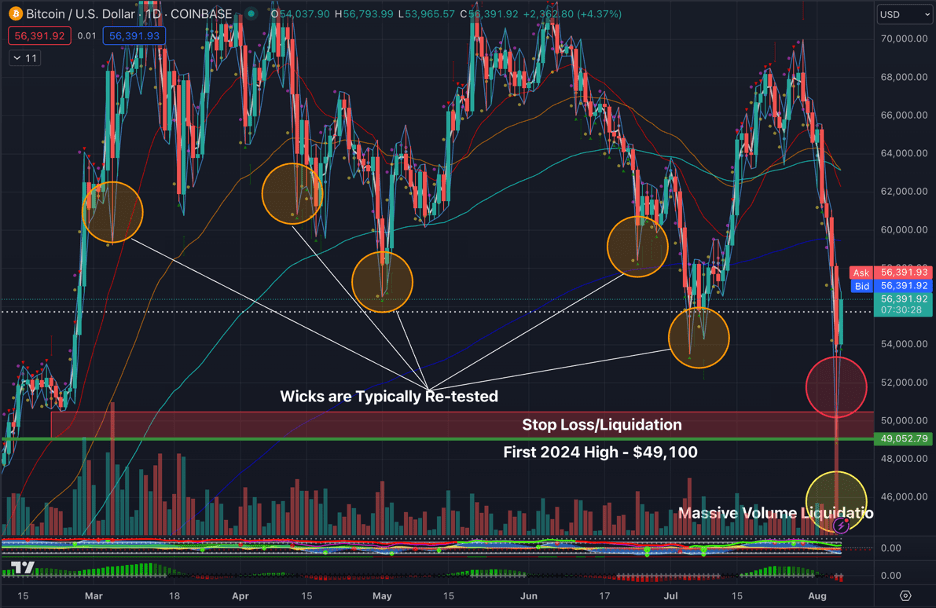 The question now is whether this latest wick, which is part of a candle that measured a $10k range. Look at the accompanying, massive volume candle. It is possible that we just go up from here, but I’m not willing to go all-in on that bet.