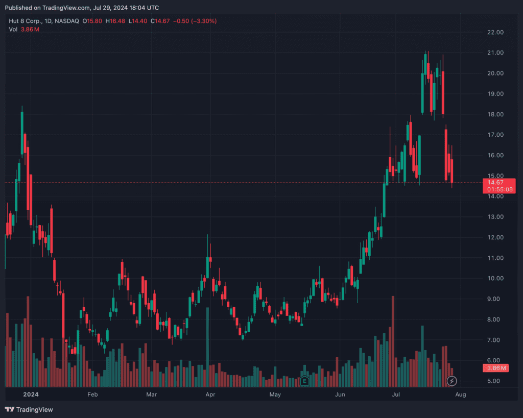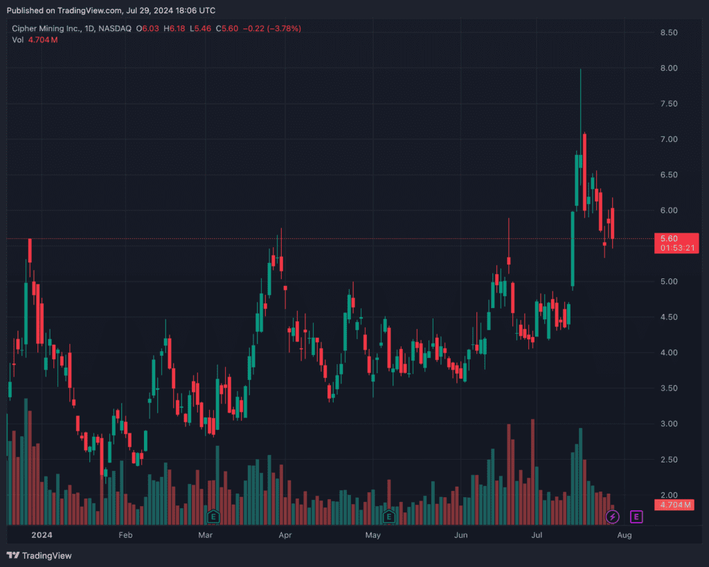 The rally in Hut 8 has also been impressive, running up from $8.67 to $21.10 before settling in around $15 today. Cipher Mining in turn rallied from $3.71 to $6.84 before giving back some of these gains to trade at $5.60 today.