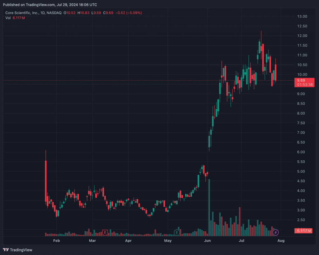 Core Scientific, the self-proclaimed first mover that “created the category of BTC miners moving into HPC”, appears to acknowledge many of these challenges. Throwing caution to the wind, investors have welcomed the move to HPC. Since sharing a panel with CoreWeave during Consenus 2024 in Austin in late May, Core Scientific stock has rallied from $4.75 to a high of $11.81 before settling in around $10 today. Along the way, Core Scientific rejected an all-cash bid from CoreWeave at $5.75.